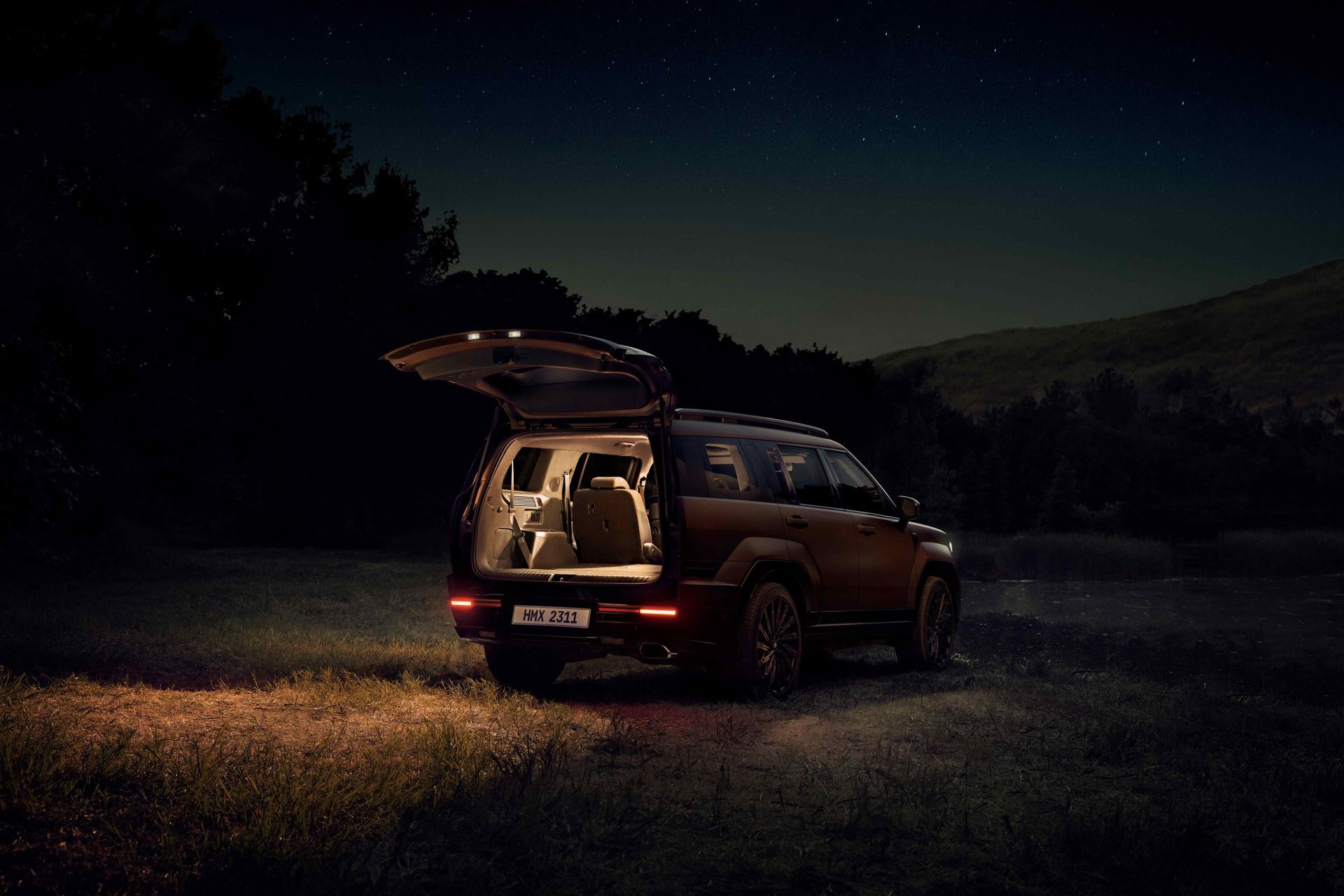 Linia indrazneata a plafonului, volumul semnificativ in jurul aripilor, pasajelor rotilor puternic conturate si jantele de 21 de inchi1 confera SUV-ului un aspect robust. Partea din spate a fost simplificata, fiind definita de hayonul de mari dimensiuni, luminile in forma literei „H” subliniind aspectul general armonios.
