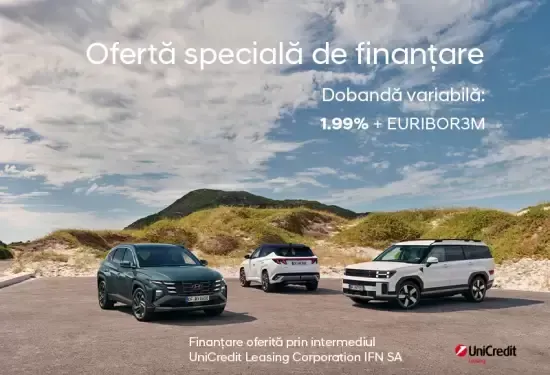 Oferta supusa unor termene si conditii, fara valoare contractuala, in limita stocului disponibil, valabila pana la data de 30 septembrie 2025. Preturile afisate pe acest site, aferente fiecarei configurari, reprezinta preturi recomandate de Importatorul Hyundai Auto Romania, fara caracter obligatoriu pentru Reteaua de distribuitori autorizati. Preturile contin TVA. Distribuitorul Autorizat ramane liber sa isi stabileasca propriile preturi, in conformitate cu propria politica comerciala si de pret, stabilind pretul de vanzare al unitatii Hyundai, fara vreo implicare din partea Hyundai Auto Romania. Datorita modificarilor tarifare sau evolutiilor constante ale produselor, preturile si echipamentele afisate, standard sau optionale pot sa nu reflecte intocmai ultimele preturi recomandate de Importatorul Hyundai Auto Romania. Preturile nu includ echipamente, accesorii sau dotari optionale. Imaginile sunt cu titlu de prezentare.
